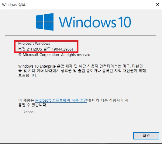 그럼 Windows 정보가 나오고 여기서 버전과 빌드가 나오는 것을 볼 수 있어요. 제 컴퓨터는 현재 21H2 버전이고 19044.2965 빌드네요. 이것을 보고 현재 윈도우가 최신인지 아닌지 알 수 있어요.