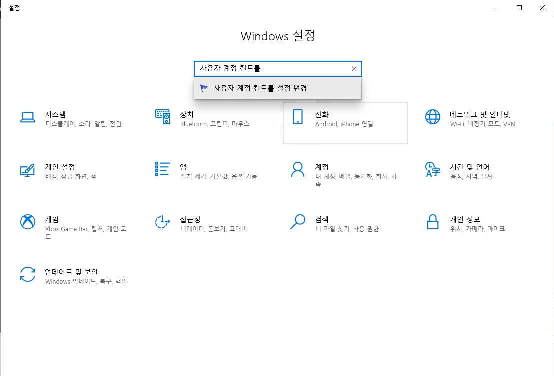 설정에서 가운데 검색에서 사용자 계정 컨트롤을 입력한 다음에 엔터를 클릭해수면 바로 사용자 계정 컨트롤 설정에 들어갈 수 있어요.