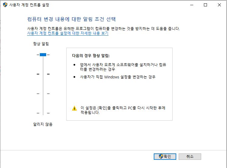 윈도우 사용자계정 컨트롤 설정