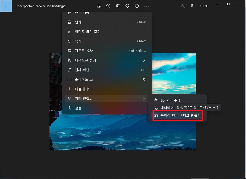 거기서 기타 편집-음악이 있는 비디어 만들기를 클릭해주세요.