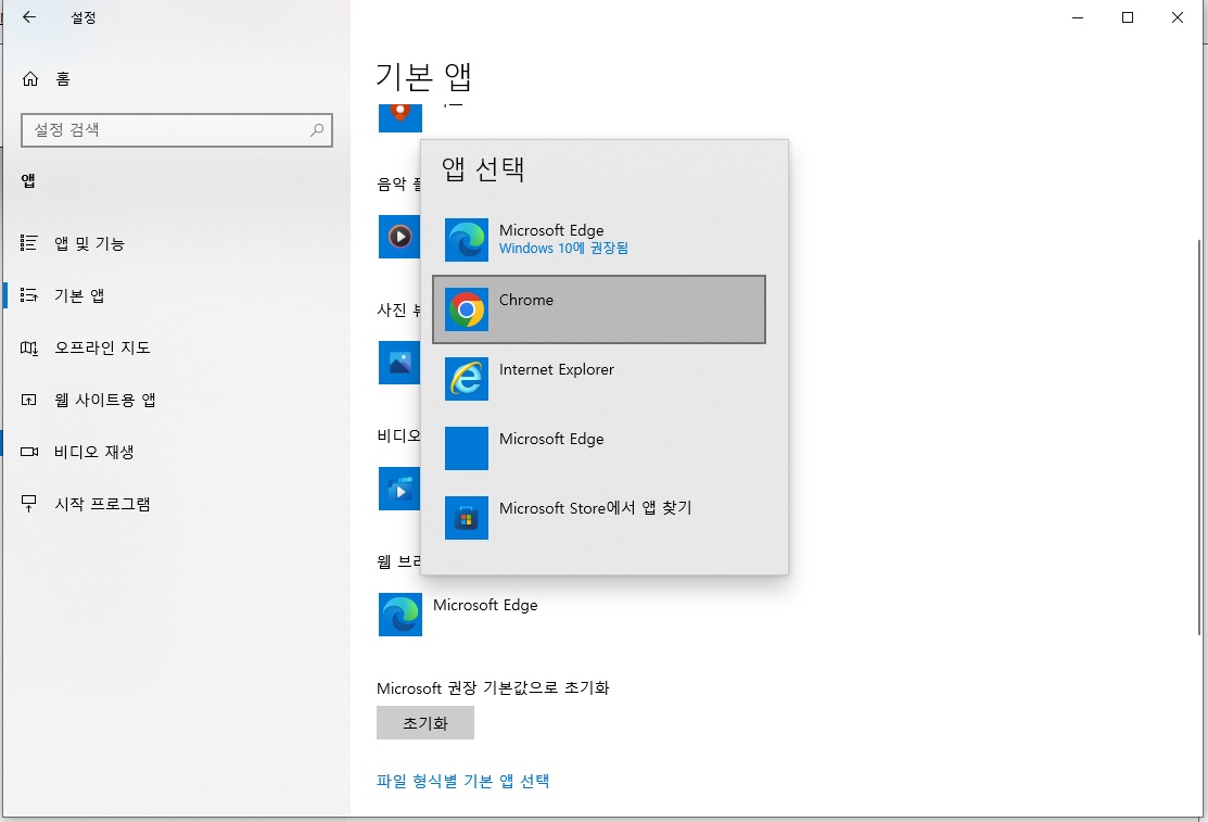 기본 브라우저를 선택한 다음 크롬을 클릭해주세요.