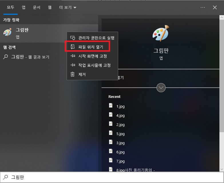 먼저 원하는 앱의 파일 위치를 찾아야합니다. 저는 그림판을 검색한 다음 오른쪽 클릭해서 파일 위치 열기를 클릭해볼게요. 그럼 실제 앱이 있는 파일 경로를 파일 탐색기에서 바로 볼 수 있어요.
