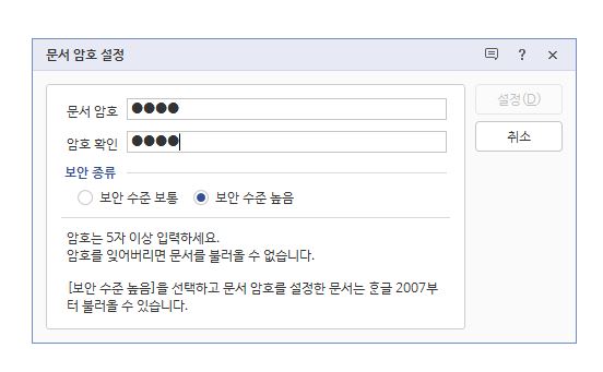 문서 암호와 암호 확인을 입력해주시면 되요. 암호는 5자 이상 입력해주시면 되요. 보안 수준 높음으로 해주시는게 보안 설정에 더 좋답니다.