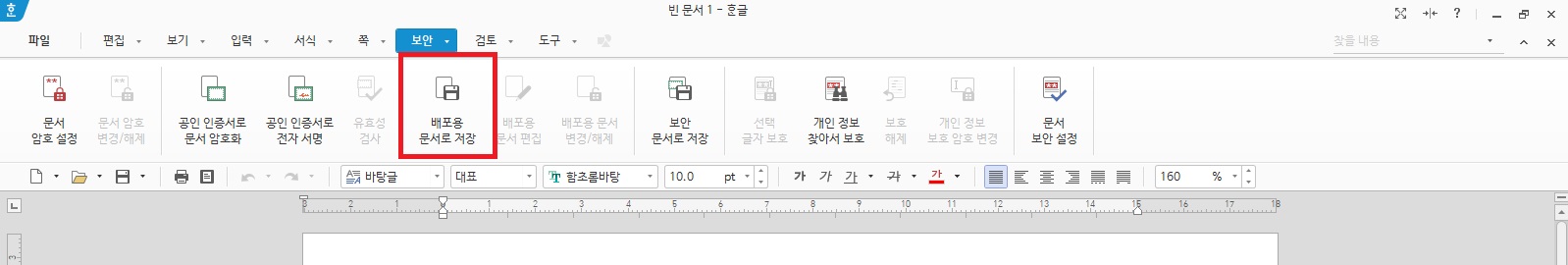 이번에는 배포용 문서를 저장하는 방법에 대해서 알아볼게요. 문서를 볼수는 있지만 암호가 걸려 있어서 편집은 할 수는 없는 암호 설정 방법이에요. 상단 보안 메뉴에서 배포용 문서로 저장을 클릭해주세요.