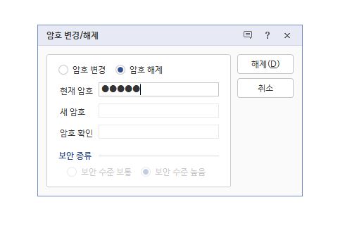 암호를 해제할려면 마찬가지로 상단 보안 메뉴를 클릭한 다음에 문서 암호 변경/해제를 클릭하면 되요. 그럼 아래처럼 암호 변경이나 해제를 할 수 있어요. 물론 기존 암호를 알고 있어야 변경하거나 해제할 수 있어요.