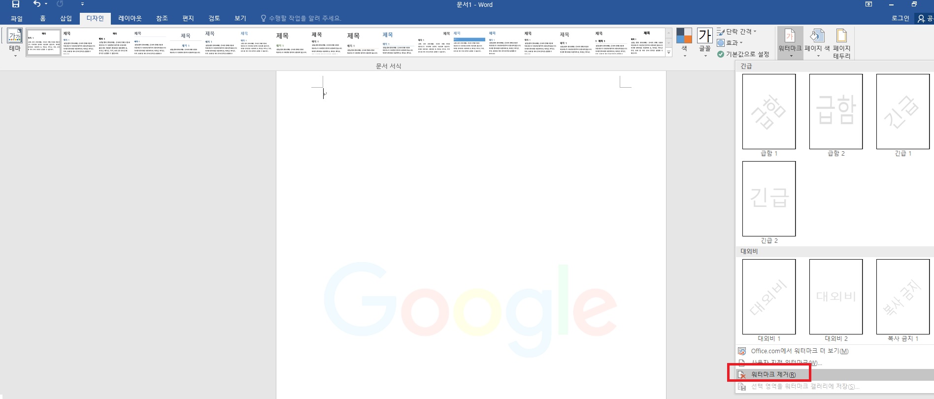 워드 문서에서 상단 디자인 메뉴를 클릭하시면 워터마크라는 버튼이 있습니다. 이 버튼을 클릭해주세요.