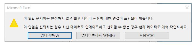 엑셀 문서를 열었을때 아래와 같은 오류가 나오는 것은 외부에 참조가 되어 있다는 의미입니다. 업데이트를 하게되면 외부 참조문서를 업데이트하게 되죠. 하지만 오류 중에 [통합 문서에 지금 업데이트할 수 없는 연결이 하나 이상 있습니다.] 라는 오류가 나오는 경우는 연결끊기를 해줘야됩니다.