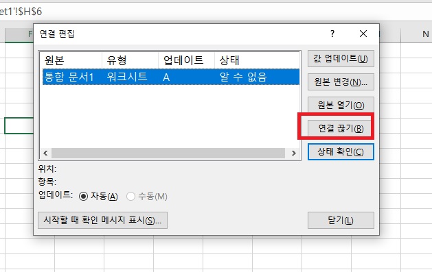 상단 메뉴 데이터-연결 편집을 클릭해주세요. 그럼 연결된 모든 링크를 볼 수 있어요. 시트가 많고 큰 문서의 경우는 일일이 셀을 눌러가면서 연결된 것을 찾기는 정말 어렵기 때문에 꼭 이 기능을 사용해야해요.