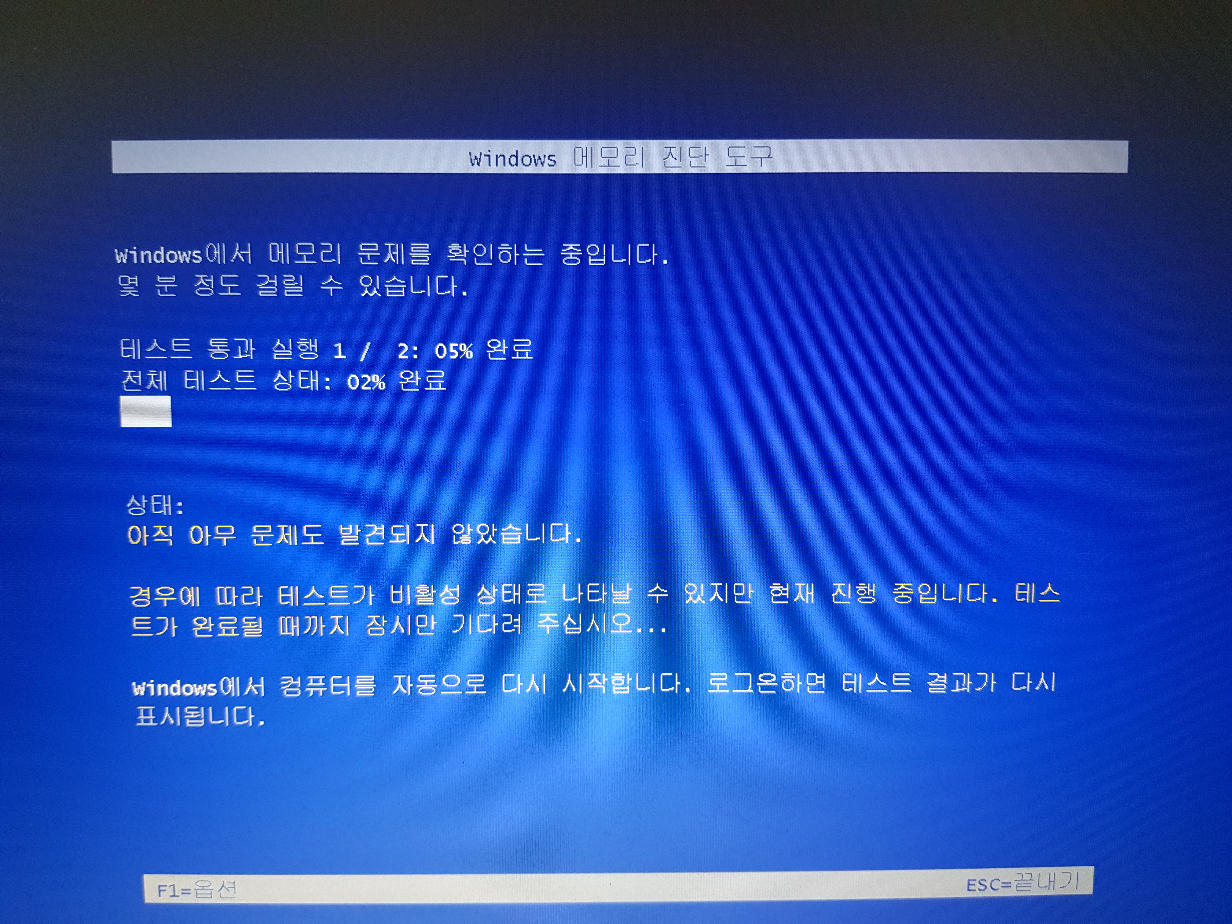 그럼 아래처럼 메모리 진단도구가 나오고 메모리 검사가 완료 된 후 이상이 있으면 결과를 보여줄 수 있답니다. 정말 간단하게 컴퓨터 진단 할 수 있는 방법이에요.