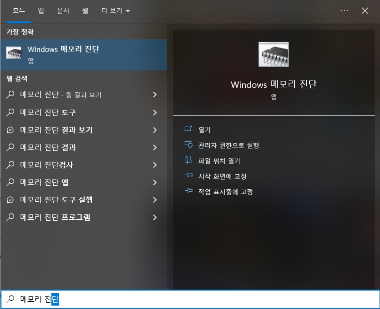 윈도우 검색에서 Windows 메모리 진단을 검색하면 아래 사진처럼 메모리 진단 프로그램이 나옵니다. 이것만 클릭하면 간단하게 메모리 진단을 할 수 있어요.