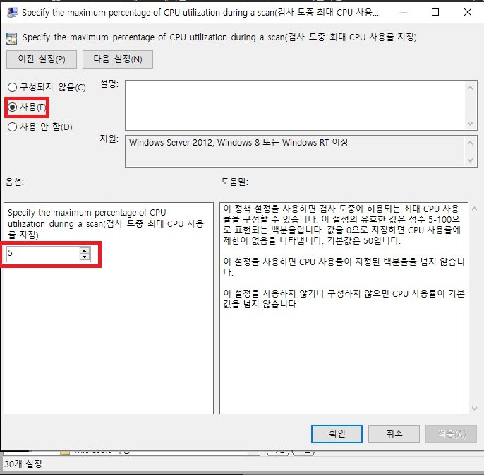 그럼 검사 도중 최대 CPU 사용량을 설정할 수 있어요. 사용을 해주고 아래 옵션에 5~10 사이를 선택해주시면 된답니다. 기본적으로 50%까지 사용한다고 하지만 저는 95%까지 사용되는 것도 보았기 때문에 5로 설정했어요.