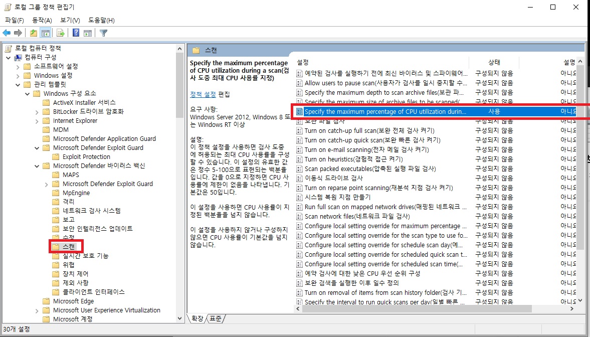 로컬 그룹 정책 편집기에서 컴퓨터 구성-관리템플릿-Microsoft Defender 바이러스 백신-스캔을 들어가면 아래 설정에 항목이 있어요. 그걸 더블 클릭해서 들어가주세요.