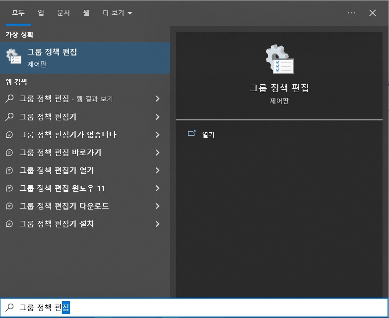 시작에서 그룹 정책 편집을 검색해주신 다음에 들어가주세요.