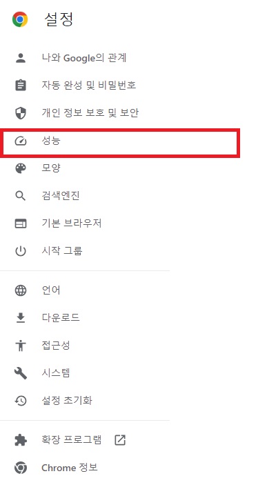 설정 화면에서 왼쪽에 성능이라는 메뉴가 있습니다. 성능을 클릭해주세요.