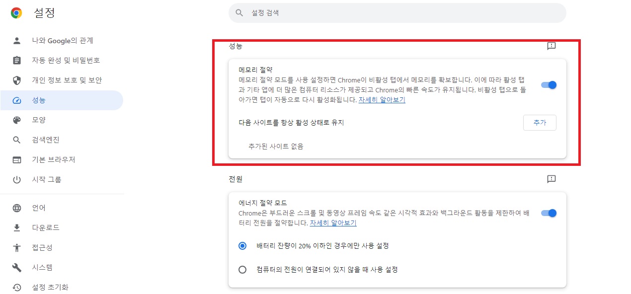 성능에서 메모리 절약 모드를 활성화 해주세요. 메모리 절약 모드를 설정하면 크롬 중 비활성화 탭에서 메모리를 확보할 수 있어요. 이 뜻은 실제로 사용하는 탭만 메모리를 사용하고 그 외는 메모리를 사용하지 않도록 하기 때문에 속도가 더 빨라지는 것이죠. 그리고 다음 사이트를 항상 활성 상태로 유지에 추가를 해주면 그 사이트는 항상 빠른 속도를 유지할 수 있답니다.