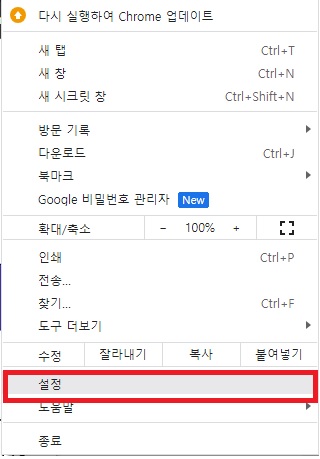 구글 크롬 오른쪽 상단에 ...을 클릭해서 설정을 클릭해주세요. 크롬 설정은 다양한 편의 설정 등을 할 수 있기 때문에 자주 들어가는 메뉴에요.