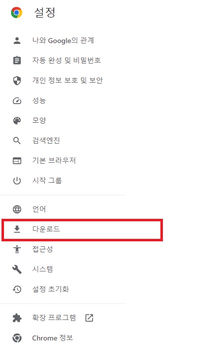 설정 창에서 왼쪽을 보면 다운로드가 있습니다. 다운로드 메뉴는 다운로드와 관련된 다양한 설정을 할 수 있어요.