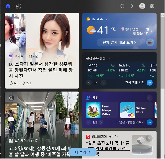 윈도우 하단 작업표시줄에 뉴스 및 관심사를 누르면 아래처럼 뉴스와 날씨, 그리고 주식 정보 등 다양한 정보를 보실 수 있어요. 하지만 보통 여기보다는 뉴스 포털에서 보는게 더 편하죠. 이 뉴스 및 관심사가 나오지 않도록 해볼게요.