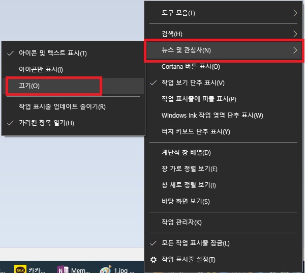 간단하게 없애는 방법은 작업표시줄에서 오른쪽 클릭한 다음 뉴스 및 관심사-끄기를 눌러주면되요. 그럼 간단하게 뉴스 및 관심사가 없어진 것을 작업표시줄에서 볼 수 있어요. 뉴스 및 관심사는 계속 업데이트 하기 때문에 가끔 PC가 느릴때 작업관리자를 보면 뉴스 및 관심사에서 CPU 사용량이 높아지는 문제가 있고 이렇게 끄면 해결 된답니다.