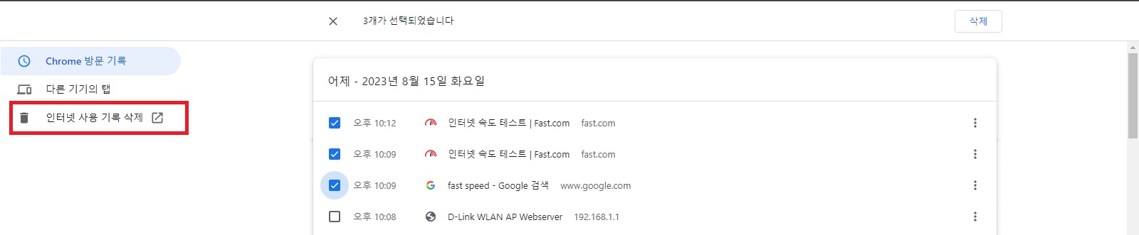 방문기록 페이지에서는 지금까지 방문했던 모든 페이지가 저장되어 있어요. 특정 페이지만 삭제할려면 방문 페이지 왼쪽 체크박스를 클릭한 다음 오른쪽 상단에서 삭제를 클릭하면 원하는 페이지만 골라서 삭제할 수 있어요.