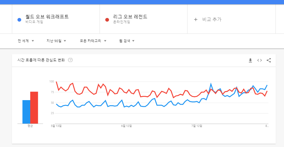 위 이미지에 보시는 것과 같이 계속해서 낮은 관심도를 보이다가 7월 초부터 급격히 상승하기 시작하더니 리그 오브 레전드를 넘어선 검색량을 보이기 시작했습니다. 많은 사람들이 관심을 가지고 있다는 것이죠. 한가지 궁금해 하실 사항은 한글로 검색했는데 어떻게 전 세계 검색량을 알 수 있을까 라는 것입니다.