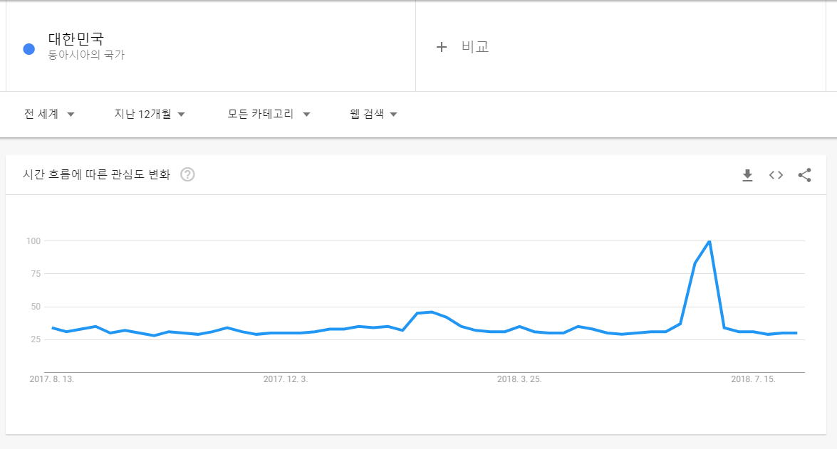 거의 변화가 없다가 갑자기 검색량이 급증하는 시기가 있습니다. 저 시기가 남북정상회담 때 입니다. 남북정상회담 때 전 세계적으로 관심이 많이 생겼고 그와 동시에 검색량이 급증한 것입니다.