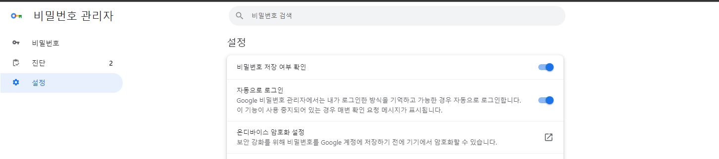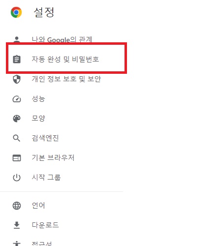 왼쪽 메뉴 중에서 자동 완성 및 비밀번호 메뉴를 들어가주세요.