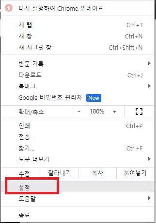 크롬 오른쪽 위 ...을 클릭하면 아래 메뉴가 나오는데 여기서 설정을 클릭해주세요. 크롬 브라우저 설정에는 다양한 기능을 변경할 수 있어요.