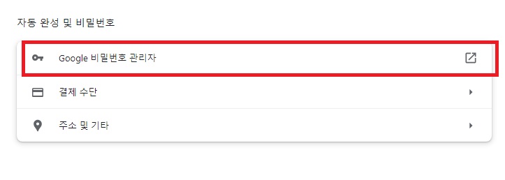 자동 완성 및 비밀번호에서 Google 비밀번호 관리자에 들어가주세요. 여기서 구글 크롬의 비밀번호 전체를 관리할 수 있어요.