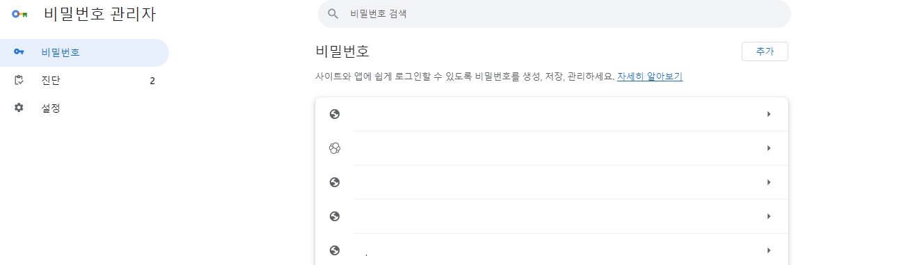 비밀번호 관리자에서 비밀번호에는 지금까지 크롬에 저장된 사이트 전체를 볼 수 있어요. 여기서 사이트를 삭제하거나 추가할 수 있어요. 자기도 모르게 비밀번호가 등록된 경우가 있기 때문에 한번씩 점검해 주는 것도 좋아요.