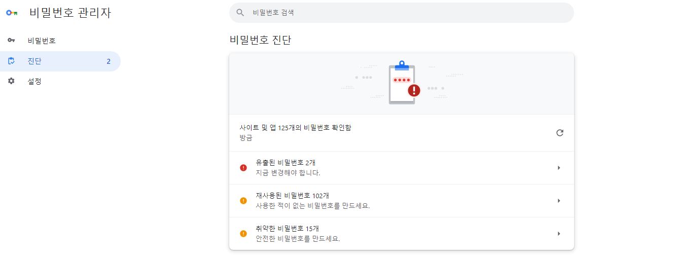 그 다음 진단 메뉴는 등록된 비밀번호 중 유출된 비밀번호화 재사용된 비밀번호에 대해서 볼 수 있어요. 여기서 유의할 것은 유출된 비밀번호의 경우 꼭 다른 걸로 변경해줘야 한답니다.
