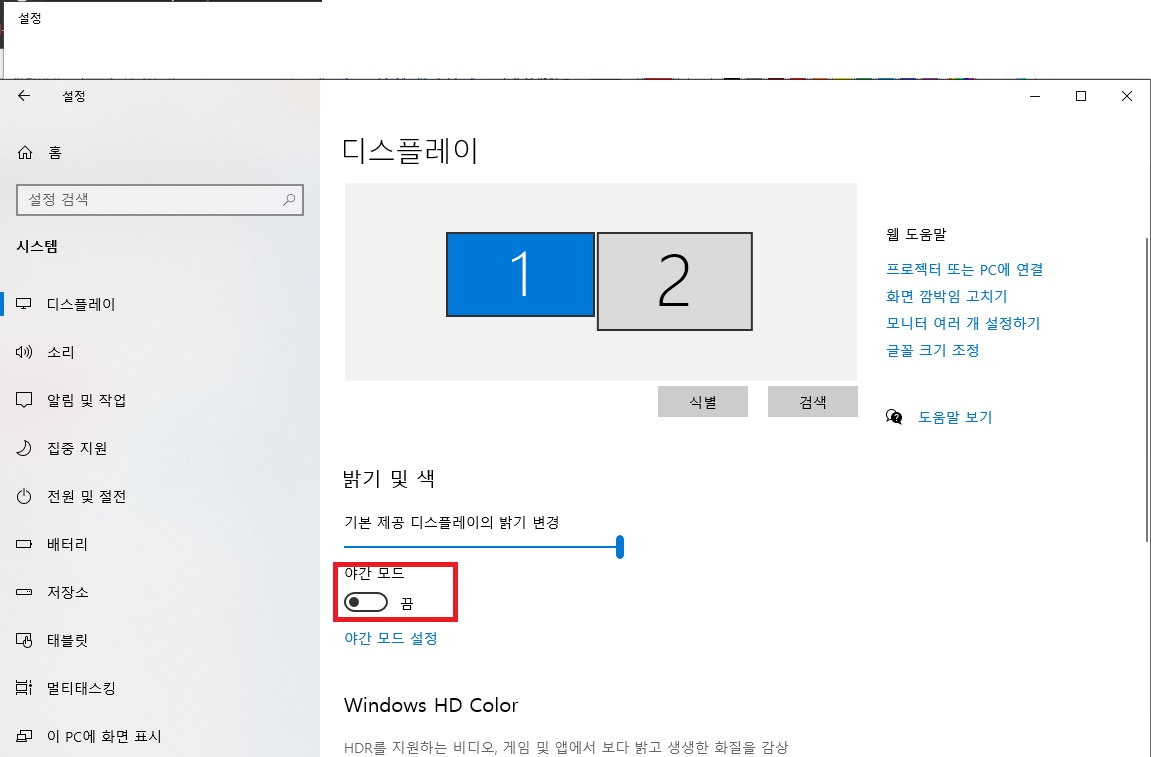 디스플레이 창에서 중간쯤 야간 모드가 있는데 여기를 활성화 해주시면 되요. 하지만 야간모드는 시간을 설정해서 특정 시간부터 바뀌도록 할 수 있기 때문에 야간 모드 설정에 들어가서 원하는 시간을 설정하면 됩니다.