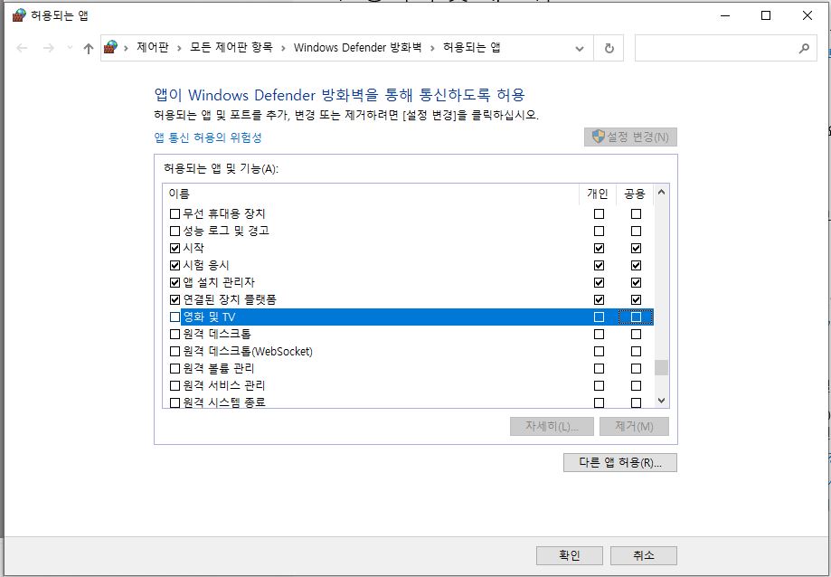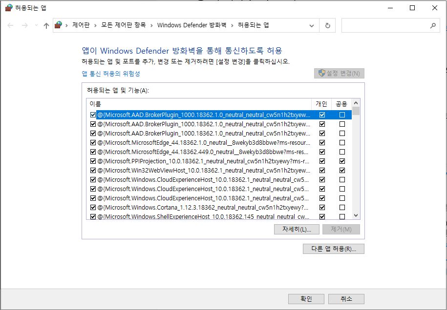 허용되는 앱 창이 나오면 앱 이름과 개인/공용을 체크하거나 해제 할 수 있어요. 여기서 원하는 앱을 찾아서 필요한 경우 방화벽을 체크하거나 해제하는 등 원하는 방법대로 설정해 주시면됩니다. 이번 글에서는 간단하게 앱 방화벽 설정에 대해서 알아 보았습니다.