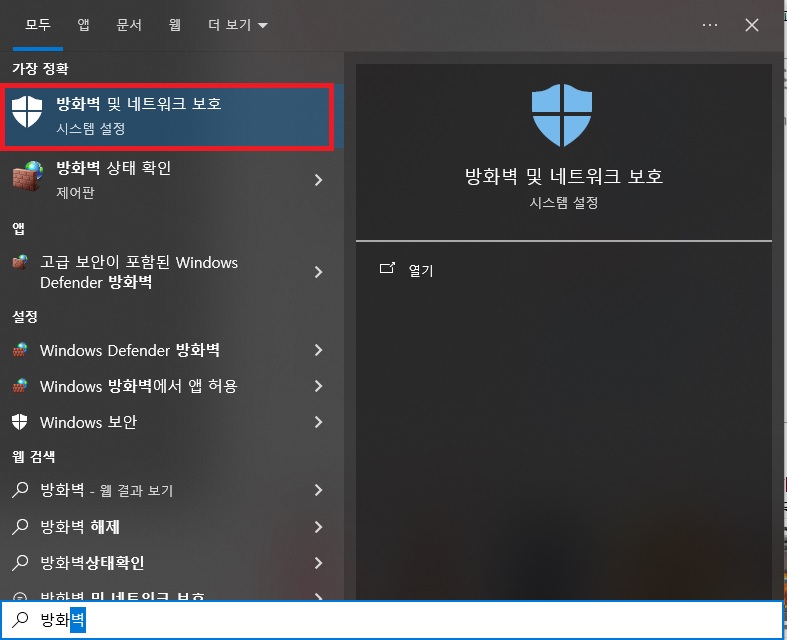 방화벽 해제를 윈해서는 방화벽 및 네트워크 보호 메뉴에 들어가야합니다. 윈도우 검색창에서 방화벽을 입력하면 아래 이지 처럼 방화벽 및 네트워크 보호 아이콘을 볼 수 있고 클릭 해주세요.