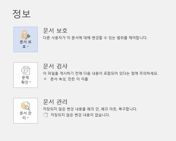 워드 문서에서 상단 메뉴 중 파일을 클릭하면 아래와 같은 화면이 나와요. 여기서 왼쪽 메뉴 중 정보를 클릭한 후 문서 보호를 눌러주세요.