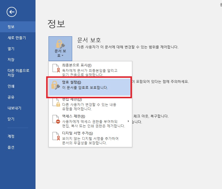 문서 보호 메뉴 중 암호 설정을 클릭해주세요. 암호를 설정하는 메뉴로 바로 접근이 가능해요.