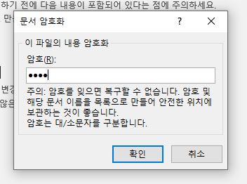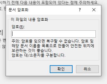 문서 암호화 창이 나오면 원하는 암호를 넣어주세요. 암호는 대문자, 소문자, 숫자, 특수문자를 혼합해서 9자리 이상 하는 것이 안전하답니다. 암호는 두번 입력해주시면 되요.