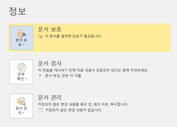그럼 아래와 같이 암호가 걸린 것을 볼 수 있어요. 암호를 해제하는 방법은 동일해요. 마찬가지로 문서 보호에서 암호 설정을 클릭해주세요.