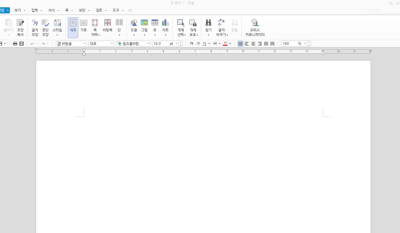 한글 문서를 열어보면 아래처럼 여백이 충분이 넓은 것을 볼 수 있습니다. 여백은 문서마다 다르게 설정해야하기 때문에 기본 여백만으로는 부족합니다.