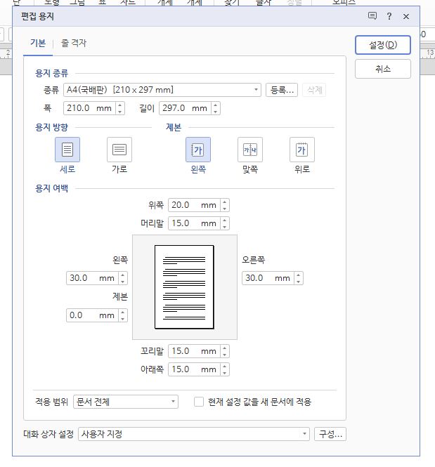 편집 용지에서 용지 여백에 위쪽, 아래쪽, 왼족, 오른쪽, 머리말, 꼬리말 여백을 원하는 크기로 설정해주면 됩니다. 문서마다 다르게 여백을 설정하면 됩니다. 이렇게 간단하게 한글 여백 설정 방법에 대해서 알아보았습니다.