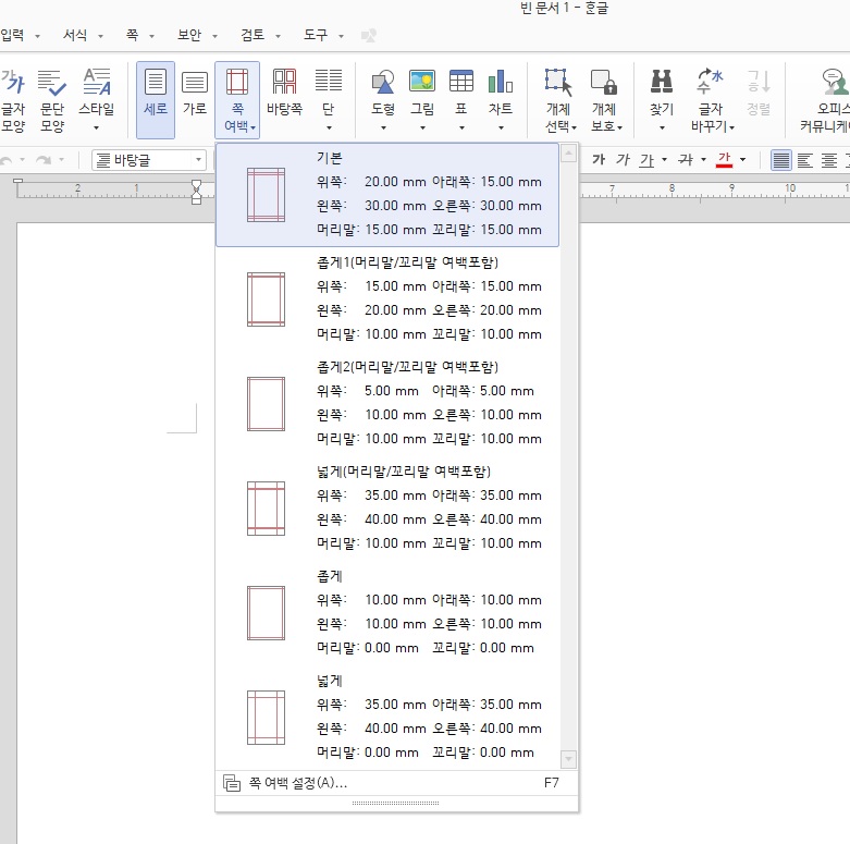 상단 메뉴에서 편집-쪽 여백을 클릭하면 기본, 좁게, 좁게2, 넓게 등 기본 설정된 여백 레이아웃이 있는 것을 볼 수 있습니다. 좁게를 하여 여백을 좁게하거나 넓게를 하여 여백을 넓게하는 간단한 방법이 있습니다. 하지만 좀 더 세밀하게 조절하기 위해서 쪽 여백 설정이나 F7을 클릭하시면 됩니다.
