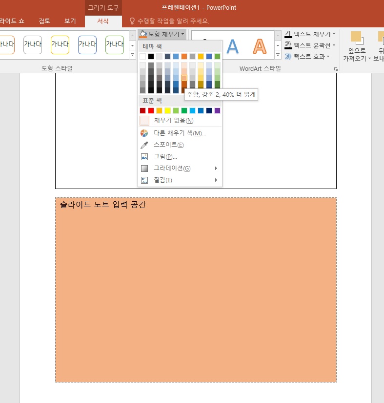 상단 메뉴 중 서식에 들어가면 슬라이드 노트 박스 채우기나 외곽선 변경 등 변경도 가능하답니다. 이렇게 간단하게 파워포인트 슬라이드 노트 입력 방법에 대해서 알아보았습니다.