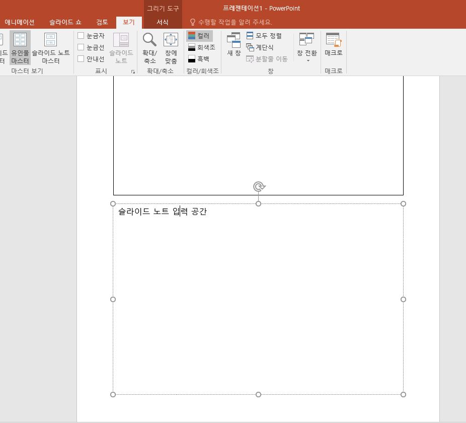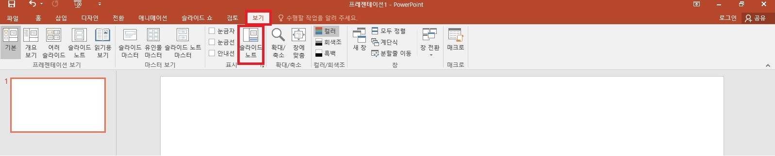 이를 위해서 상단메뉴 보기에서 왼쪽 프리젠테이션 보기 그룹에서 슬라이드 노트를 클릭해주세요.
