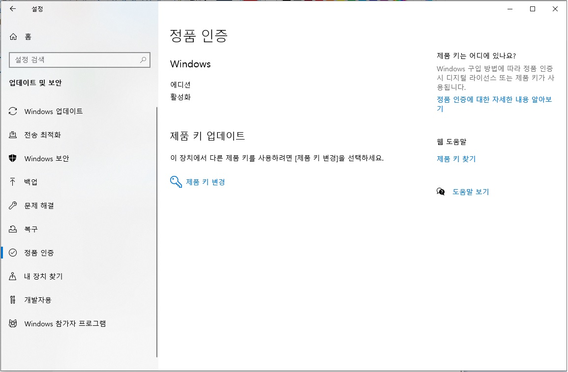 정품 인증 창에서는 현재 윈도우 에디션 그리고 정품 인증 활성화 여부에 대해서 알 수 있어요. 여기서 제품 키를 등록하거나 변경하고자 하면 제품 키 변경을 클릭해주세요.