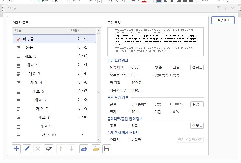 스타일을 보면 문단 모양 정보, 글자 모양 정보, 글머리표/문단 번호 정보 등을 설정할 수 있습니다.