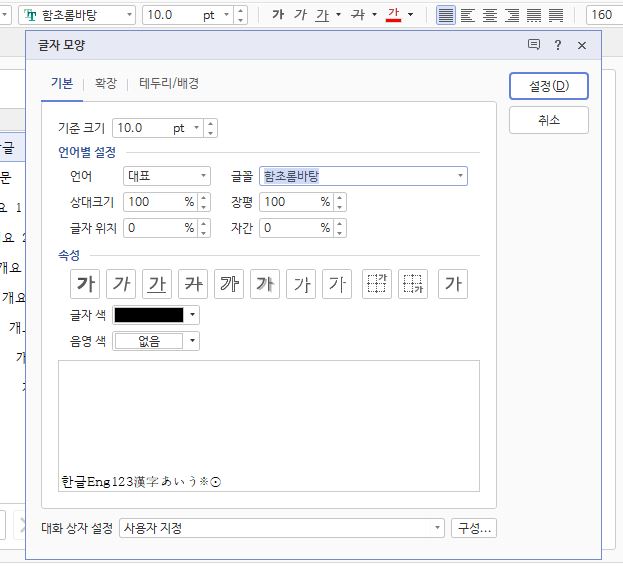 글자 모양 정보는 스타일에 맞는 기본 글꼴, 크기를 설정할 수 있습니다. 가장 자주 사용하는 글꼴이 있으면 설정해 두면 정말 편해요.