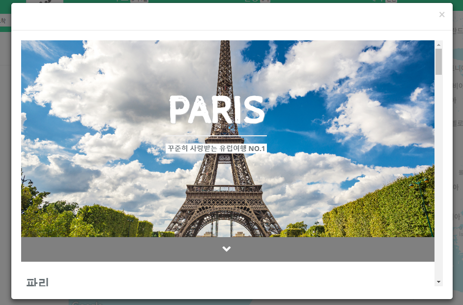 파리 가이드북을 클릭해 봤어요. 파리의 에펠탑 사진과 함께 유명한 관광지들이 쭉 나열되 있는 것을 볼 수 있습니다.