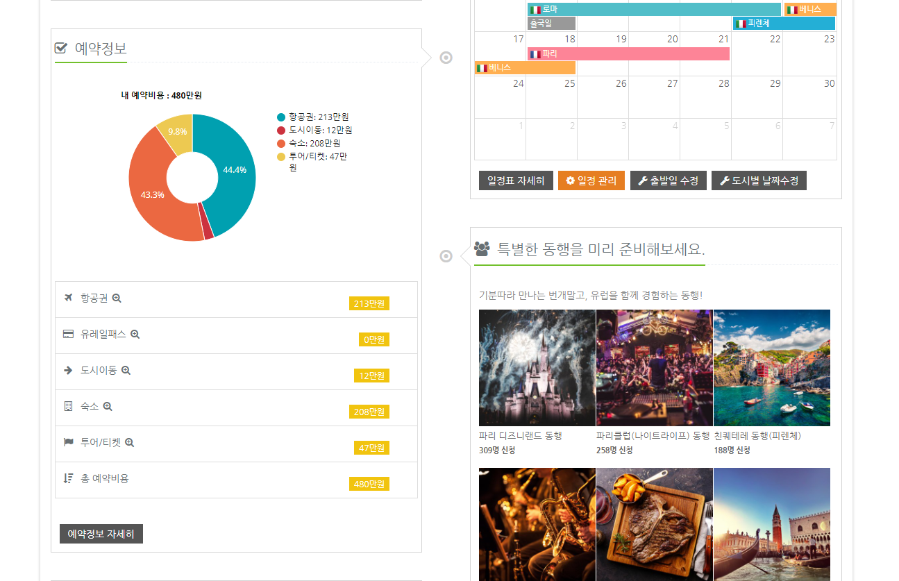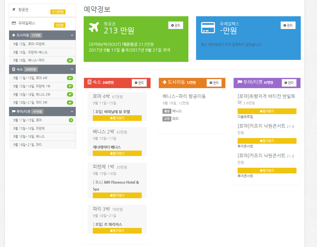 지금부터 보여드릴 사진이 제가 다녀온 신혼여행 플래너에요. 여행지에의 식사비를 제외하고 총 400만원의 경비가 들었고 제가 이용한 숙소, 투어, 그리고 이동편까지 다 볼 수 있어요. 사실 로마, 피렌체, 파리에서의 숙박은 정말 최고였어요.