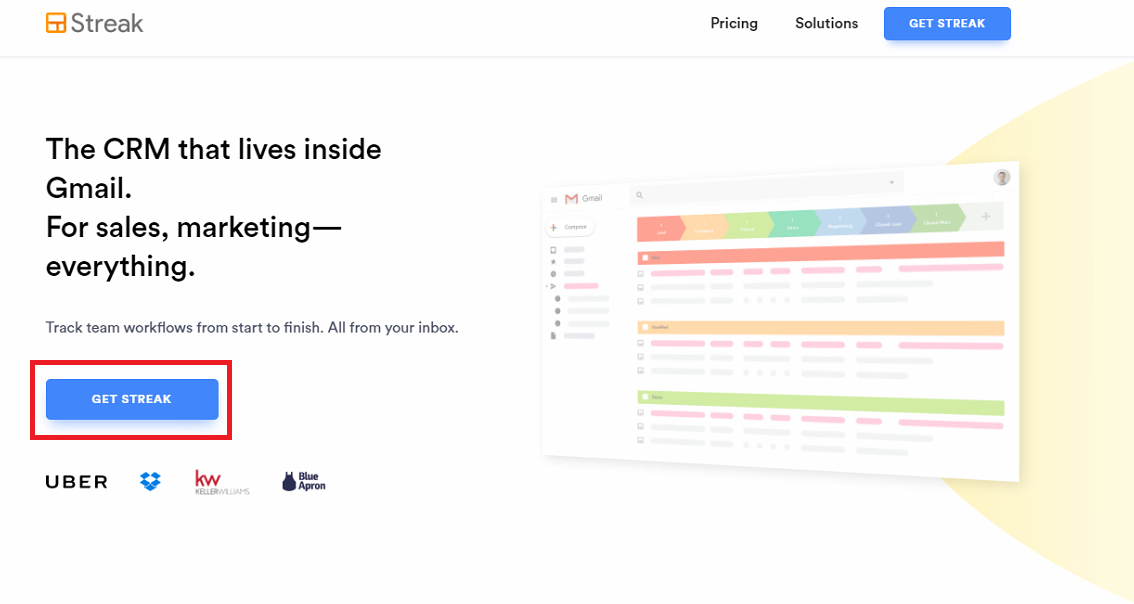 구글 지메일에서수신확인 기능을 이용하기 위해서는 앞서 말씀드린데로 Streak CRM for Gmail을 설치하시면됩니다. 먼저 https://www.streak.com/로 접속하신 다음GET STREAK 버튼을 선택합니다.