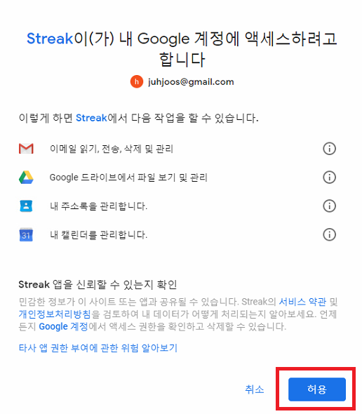 Streak가 계정 엑세스하는 범위를 알려주며허용을 클릭하면 됩니다